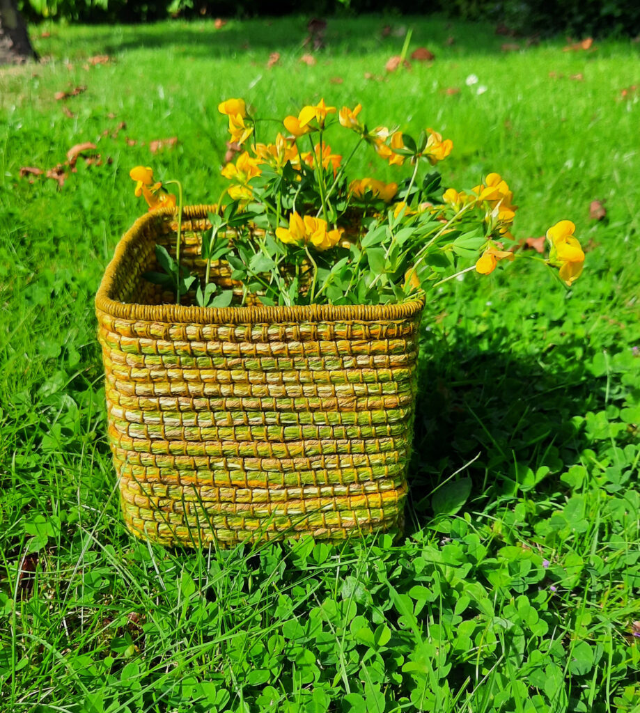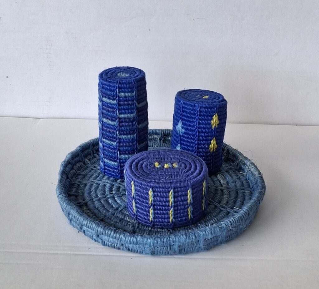 Sammenholdt med den mangfoldighed af farver, der var blevet brugt, da kurset sluttede, gav det et billede af en virkelighed, som endte med at blive meget frodig. Jeg var nødt til at binde en cylinder med samtlige garner og farver, der var blevet brugt, fordi det var to så vidt forskellige indtryk fra samme sag.