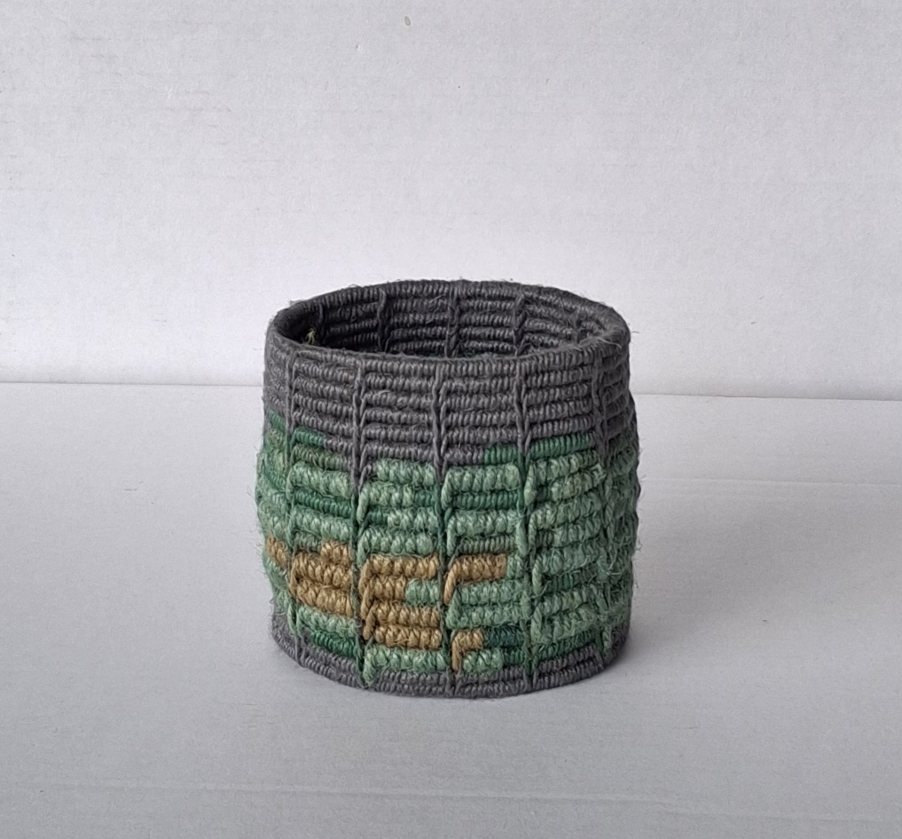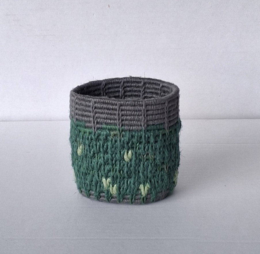 Sammenholdt med den mangfoldighed af farver, der var blevet brugt, da kurset sluttede, gav det et billede af en virkelighed, som endte med at blive meget frodig. Jeg var nødt til at binde en cylinder med samtlige garner og farver, der var blevet brugt, fordi det var to så vidt forskellige indtryk fra samme sag.